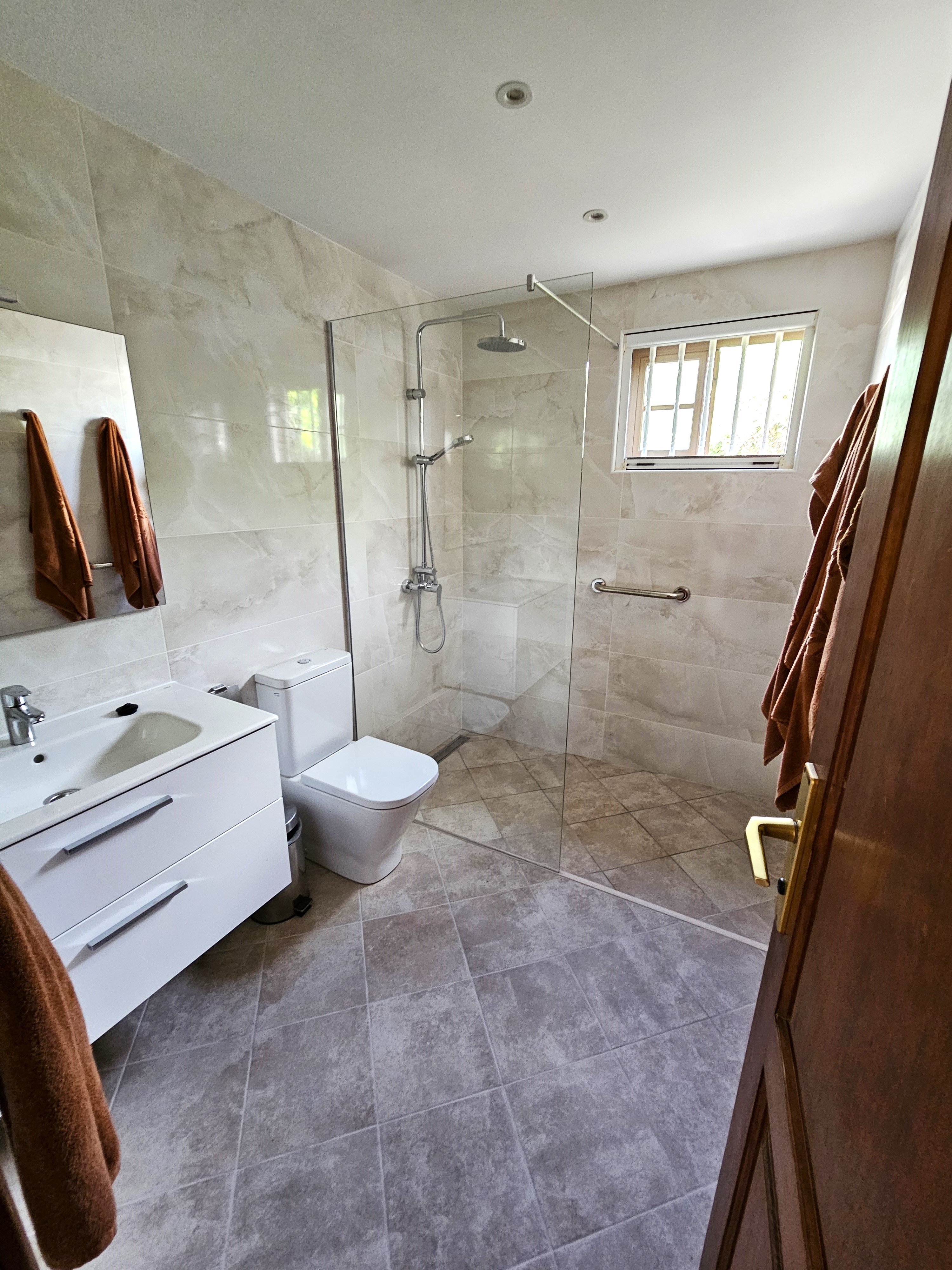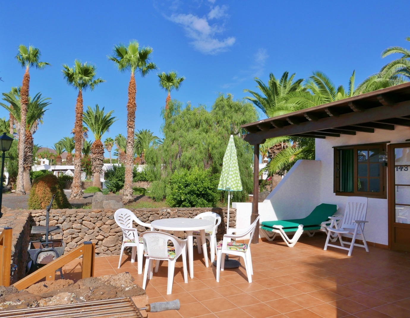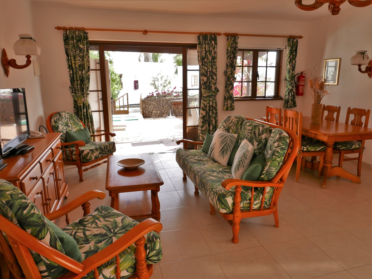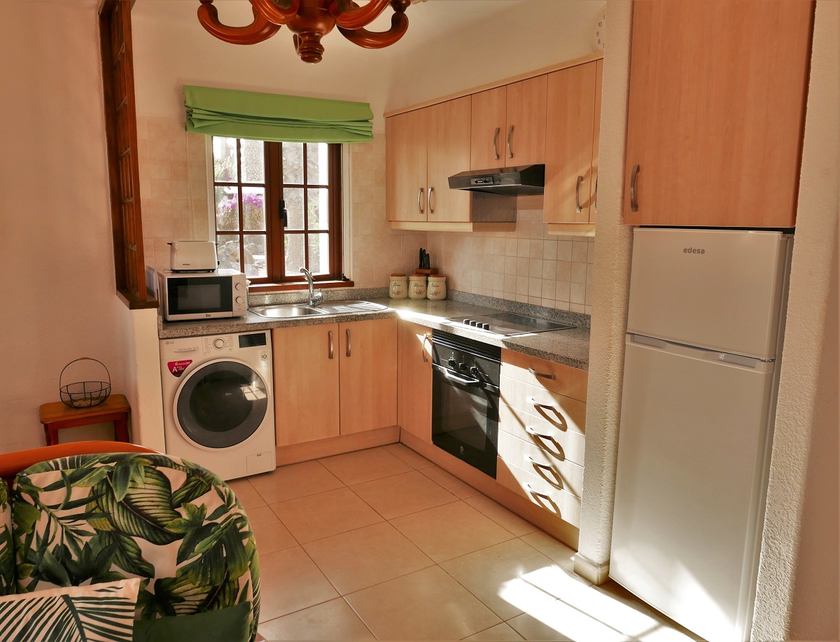 This single-storey villa is light, airy and refurbished. It is very spacious with open plan lounge/diner, fully fitted kitchen, double bedroom and shower room / WC. There is a large private sun terrace with BBQ, patio table and chairs, sunbeds and shaded area under the large pergola. All in all, a real home from home! The refitted kitchen has new tiling, granite worktop with new hob plus oven, microwave, fridge/freezer, kettle, toaster and coffee machine, and it is fully equipped with crockery, cutlery and cooking utensils. The large open plan lounge/diner is decorated and furnished to a high standard with sofa and arm chairs, various tables, lamps, sideboard and a dining table with four chairs. There is a flat screen satellite TV providing British (BBC1, BBC 2, ITV, Channel 4, Sky Sports 1, 2 plus News), Spanish, German and Italian channels. Also provided are DVD player, telephone and WiFi internet. The double bedroom has twin beds (these can be pushed together like a double if required) and there is a large double wardrobe with plenty of storage space. When more than 2 guests are staying, additional guests sleep on folding Z-beds. Maximum occupancy for this villa is 4 guests.